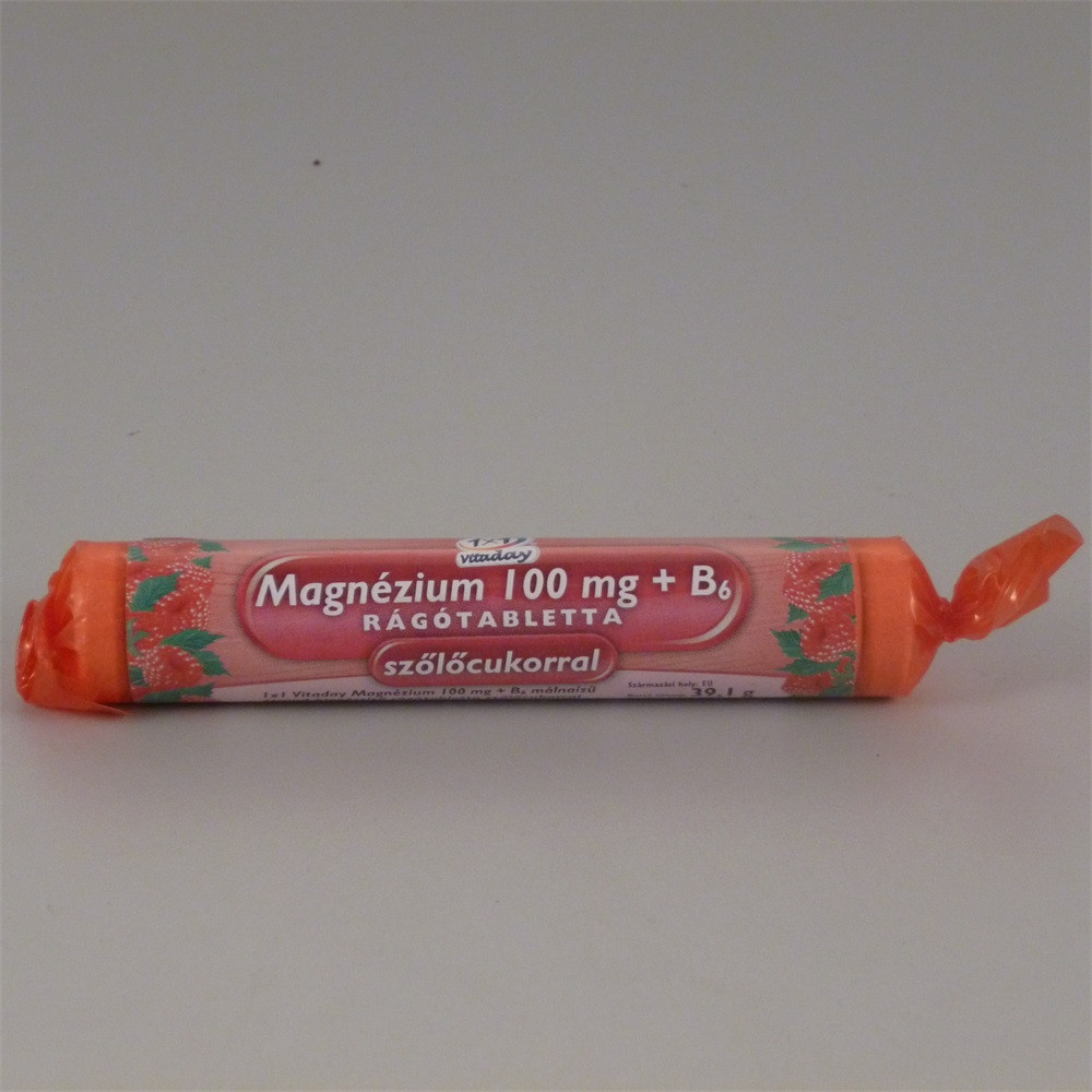 1X1 MG 100MG+B6 SZŐLŐCUKORRAL MÁLNA Az 1x1 Vitaday Magnézium 100 mg+B6 málna ízu étrend-kiegészítô rágótabletta szőlőcukorral magnéziumot tartalmaz. A magnézium hozzájárul a normál izommuködés fenntartásához és szerepet játszik az idegrendszer kiegyensúlyozott muködésében.