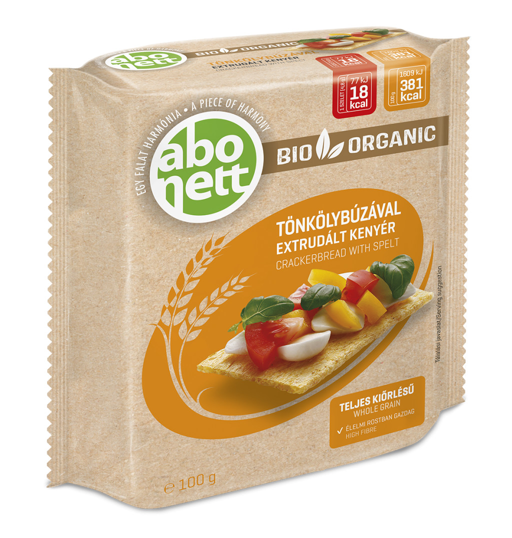 ABONETT BIO EXTRUDÁLT KENYÉR, TÖNKÖLYBÚZÁVAL, általános emberi fogyasztásra, a teljes gabonaszem felhasználásával készülő, élelmi rostban gazdag, ropogós finomság. Kiváló alap a legkülönbözőbb feltétekhez (pl.: felvágottak, sajtok, dzsemek, szendvicskrémek, zöldségek, halkészítmények).