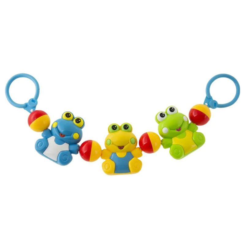 Minőségi műanyagból készült babakocsi csörgő édes békás figurákkal. Az élénk színű csörgő játék vonzza a gyermek figyelmét és leköti séta közben.