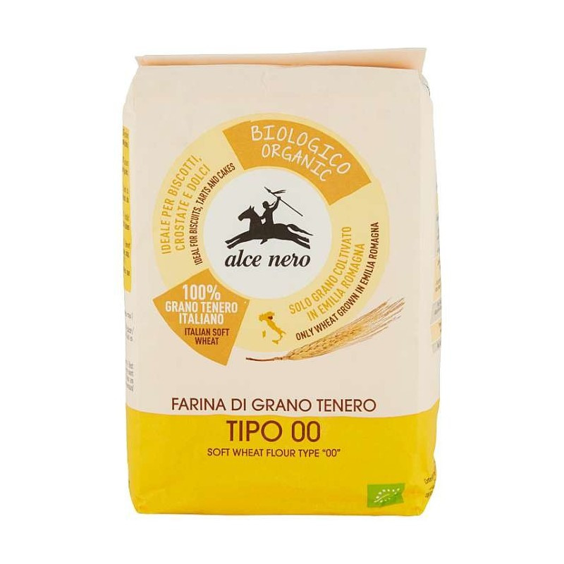 Az Alce Nero „00” típusú organikus búzalisztet csak az Emilia Romagna-ban termesztett organikus búza felhasználásával állítják elő, és különösen fehér színű, mivel csak a gabona szívét őrlik meg. Desszertek, kekszek és torták készítéséhez ajánlott.