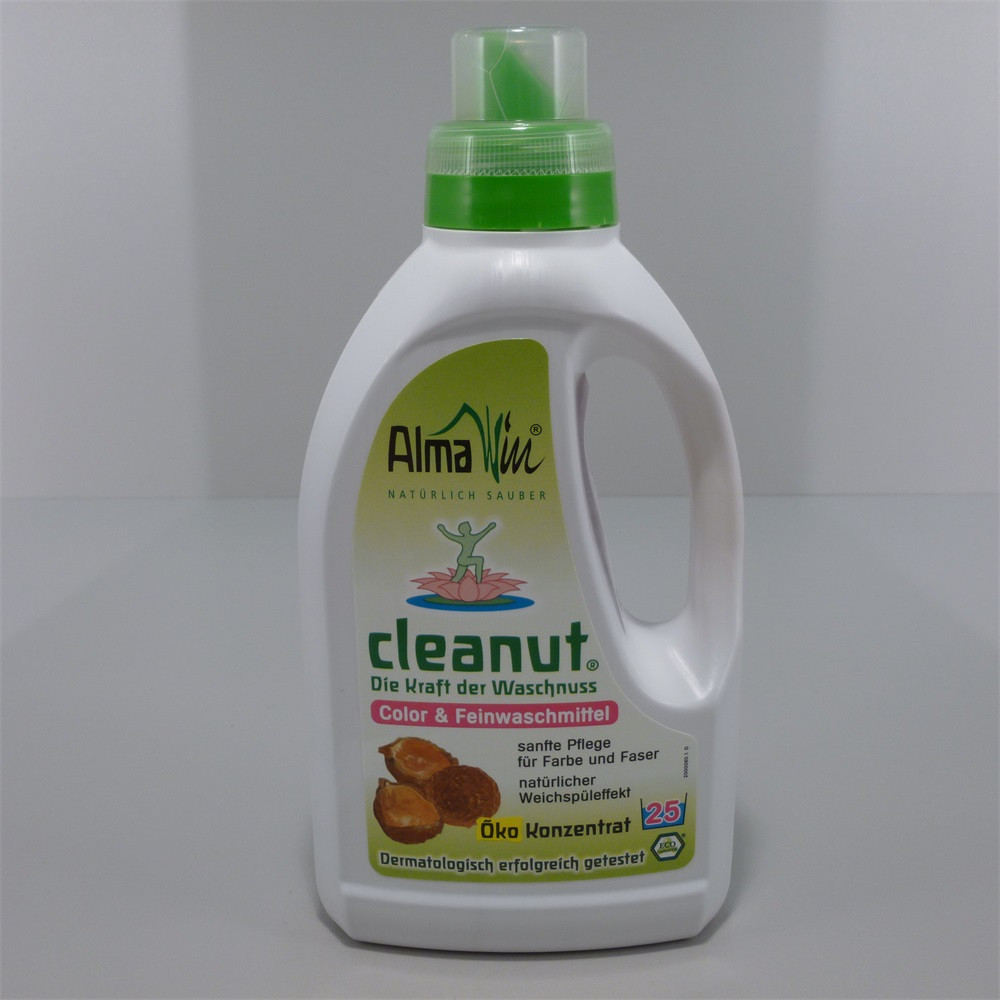 Összetevők:  : >=5% <15% soap (plant oil soap*), anionic surfactants (soapnut extract). Contains perfums (essential oils: vervain-limone and eucalyptus*), Limonene, Citral, Geraniol, Linalool, Citronellol. Further ingredients: water, ethanol, potassium salt of citric acid, potassium carbonate, lactic acid, xanthan gum, citric acid, wheat proteins. 100% of the ingredients are of natural origin. *certified organic.
