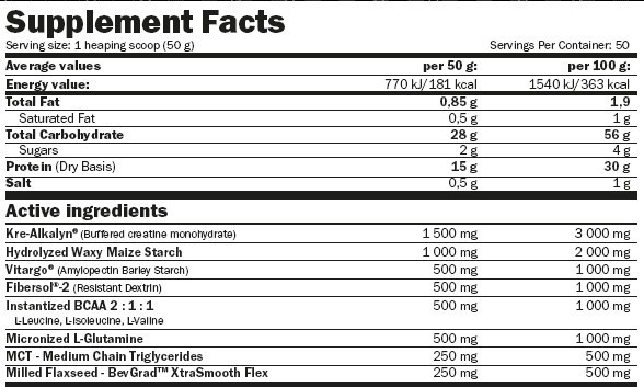 Összetevők 100 g-ban: AmixTM Reco-Pro Protein Complex (tejsavófehérje koncentrátum /tejből/, CFM® - Keresztáramú mikroszűrős tejsavófehérje izolátum /tejből/, Marha fehérje-izolátumból származó aminosavak, tejsavófehérje-hidrolizátum /tejből/ ), viaszos kukoricakeményítő, maltodextrin, Palatinose® (izomaltulóz), kreatin-monohidrát - Kre-Alkalyn® 2000 mg, őrölt lenmag (BevGrad™ XtraSmooth Flax 1500 mg, kreatin-monohidrát 1000 mg, kreatin-bilaglikina 0 magnézium-kreatin-magnézium0 mg, kakaópor (csak csokoládé ízben), stabilizátor: nátrium-karboxi-metil-cellulóz; di-kalcium-foszfát, dinátrium-foszfát, L-leucin 500 mg, L-glutamin 500 mg, L-glutamin alfa-ketoglutarát 500 mg, di-kálium Foszfát, L-Izoleucin 250 mg, L-Valin 250 mg, emulgeálószer: szójalecitin; aroma, aszkorbinsav (C-vit), édesítőszerek: szukralóz és aceszulfám-K; céklalé (csak erdei gyümölcs ízben), színezék: kurkumin (vaníliás-joghurtos ízű). A CFM® a Glanbia PLC bejegyzett védjegye. A Kre-Alkalyn® a Bioceutical Research and Development Laboratory (BR&D) bejegyzett védjegye. Kreatin-monohidrát korrigált pH-val – US szabadalom #6,399,661. Nemzetközi szabadalmak függőben. Minden nemzetközi jog fenntartva. A Creatine MagnaPower® az Albion Laboratories, Inc. bejegyzett védjegye. Allergén figyelmeztetés: Nyomokban tojást, glutént, kagylókat, dióféléket és földimogyorót tartalmazhat. Figyelmeztetés: A terméket nem gyermekek számára tervezték. Gyerekektől távol tartandó. Ha Ön terhes vagy szoptat, a termék használata előtt kérjen tanácsot egy egészségügyi szakembertől. A termék nem helyettesítheti a változatos étrendet. Ne lépje túl az ajánlott napi adagot! Ennek az étrend-kiegészítőnek a fogyasztásával kapcsolatban konzultáljon kezelőorvosával. 25°C-ot meg nem haladó hőmérsékleten, hűvös, száraz helyen, közvetlen napfénytől védve tárolandó. A gyártó nem vállal felelősséget a nem rendeltetésszerű használatból vagy tárolásból eredő károkért. Tételszám és minőségmegőrzési idő: lásd a csomagolást.