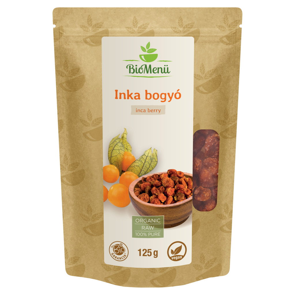 A Dél-Amerikában termesztett narancssárga aranybogyó nagy tápanyag tartalommal rendelkezik. Az inka bogyó más nevei: aranybogyó, physalis, azték bogyó és perui cseresznye. Az inka bogyó egy modern szuperélelmiszer, amely vitaminban gazdag és gyulladásgátló bioflavonoidokkal rendelkezik. A perui hegyvidéken termesztett inka bogyót betakarítják, a legjobb minőségűeket kiválogatják, majd természetes vízben tisztítják és szárítják. Ez a folyamat megőrzi a természetes, nyers tápanyagtartalmukat. Az édes inka bogyó nagyszerű nassoláshoz vagy sütési összetevőként is. A bogyók ideális összetevői sokféle süteménynek, kekszeknek, csokoládéknak és finom desszert öntetnek is.