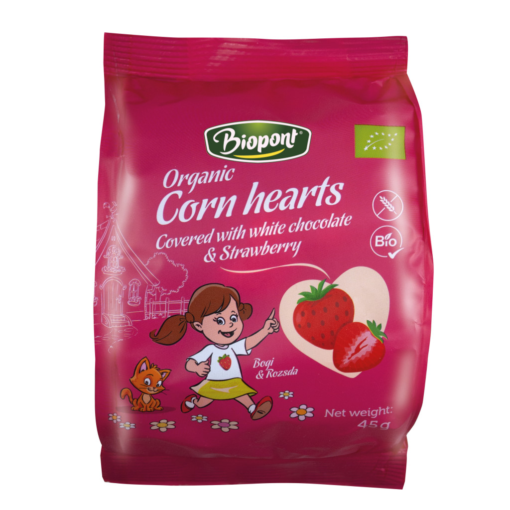 Biopont bio extrudált fehércsokoládés-epres kukorica szív gluténmentes 45 g