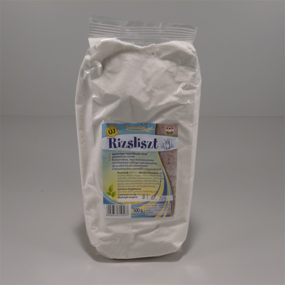 BONETTA RIZSLISZT: Finomra őrölt liszt, melyet hosszúszemű rizsből állítanak elő. Sűrítésre és tészták készítéséhez használják fel. A rizsliszt jól használható porhanyós, omlós tésztákhoz, de galuska, palacsinta, krémleves is készülhet belőle.