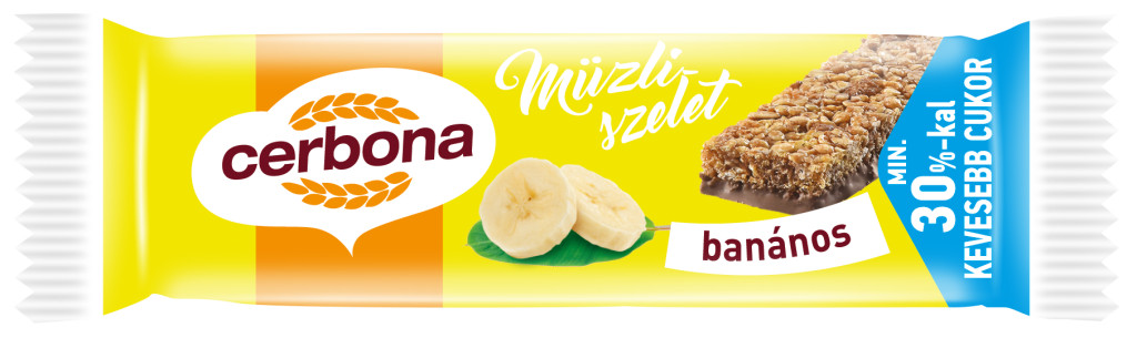 CERBONA BANÁNOS MÜZLISZELET A Cerbona Epres-Jughurtos müzliszelete 50%-kal kevesebb cukorral készült. Többfajta gabonapehely és eper és málna darabok teszik igazán ellenállhatatlanná. Epres- joghurtos bevonata kiemeli az eper izét!
