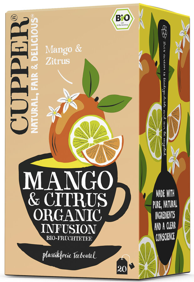 CUPPER Mangó & Citrus bio tea: Összetevők: mézbokor*, alma darabok*, édesgyökér*, természetes mangó ízesítés* (8.5%), hibiszkusz*, narancshéjl*( 3%), cikória gyökér*, limehéj* (0.5%), természetes lime ízesítés (0.5%). Édesgyökeret tartalmaz! Magas vérnyomásban szenvedők kerüljék túlzott mértékű fogyasztását! *Összetevők: Ellenőrzött ökológiai gazdálkodásból.