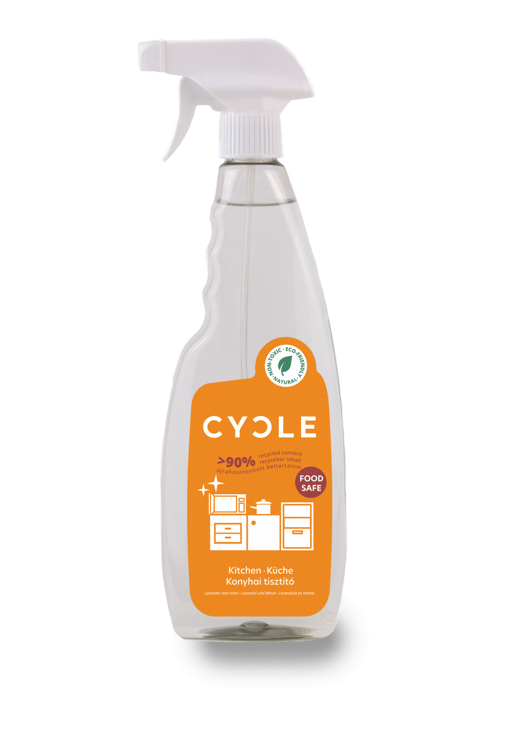 A CYCLE Konyhai tisztító a természetes felületaktív anyagainak és a szerves savaknak köszönhetően hatékonyan távolítja el a makacs szennyeződéseket a konyhai felületekről, legyen az a konyhapult, a konyhai csempe, hűtő vagy mikrohullámú sütő. Természetes összetevői csillogó tisztaságot biztosítanak. A tisztítószer több mint 90%-ban újrahasznosított alapanyagokat, ezen felül csak növényi alapú, könnyen lebomló összetevőket tartalmaz. Az ecetsav biológiailag újrahasznosított forrásból származik. A felületek egyszerűen áttörölve gyorsan száradnak. A zárófej kivételével a palack 100%-ban újrahasznosított műanyagból készült. A CYCLE Konyhai tisztítót ajánljuk mindenkinek, akinek fontos, hogy természetes módon érje el otthona ragyogó tisztaságát, melyhez hatékony, ugyanakkor környezetbarát tisztítószert használ. ÖSSZETEVŐK: újrahasznosított ecetsav és egyéb szerves savak <5%, nem ionos felületaktív anyagok <5%, nátrium-karbonát, levendula illóolaj, menta illóolaj, újrahasznosított víz