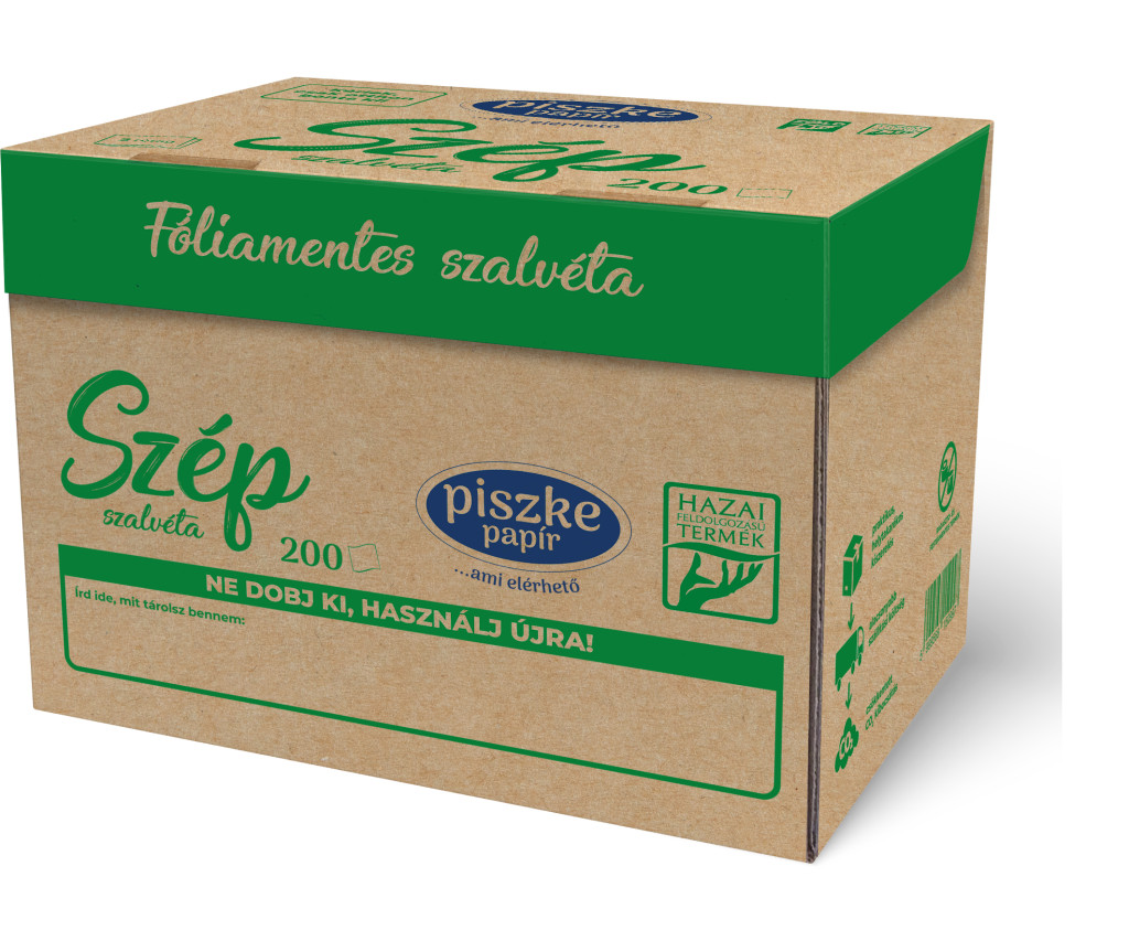 Fóliamentes csomagolású, környezetbarát Szép szalvéta. Kiváló minőségű, rendkívül puha tapintású, 100% cellulózból készült 2 rétegű szalvéta, 200 darabos kiszerelésben, 33x33cm-es lapmérettel, 1/8 hajtogatással. A termék 100%- ban hazai feldolgozású, a gyártó cég 100% magyar tulajdonban áll. Az új Szép szalvéta kialakításakor arra törekedtünk, hogy a környezetbarát, magas minőségű, esztétikus terméket biztosítsunk a vásárlóknak. Nem csak az előállítás és a szállítás során kisebb a termékek ökológiai lábnyoma a fóliamentes csomagolásnak, a nagyobb kiszerelésnek és pontos raklapkitöltésnek köszönhetően, de a dobozokat a fogyasztók hasznosíthatják otthonaikban is. A feldolgozás során nem használunk illatanyagokat. A papírdobozok újrahasznosított és újrahasznosítható, 100%-ban lebomló alapanyagokból készülnek. A doboz konstrukcióját úgy alakítottuk ki, hogy annak alapanyag igénye a lehető legkisebb legyen, miközben figyelmet fordítottunk arra, hogy az áru teljesen illeszkedjen a raklaphoz. Így a raklapot a lehető legjobban ki lehet használni, ami szintén csökkenti a csomagolás ökológiai lábnyomát.