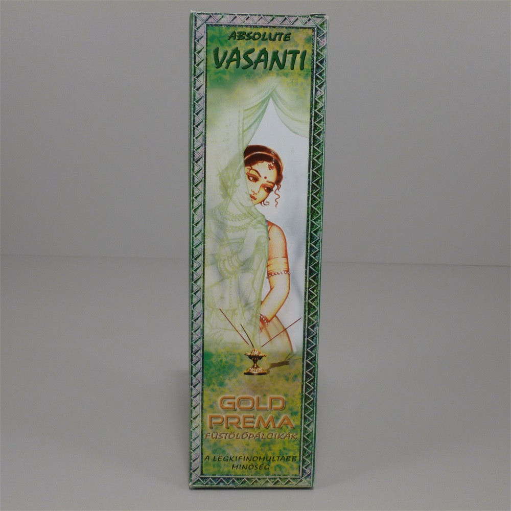 FÜSTÖLÖ GOLD PREMA VASANTI. Frissíto, a tavaszra emlékezteto illat, mely eluzi a nyomasztó gondolatokat; Tartalmaz kewra, tömjén, szantál és pacsuli olajat; Serkenti a kreativitást.