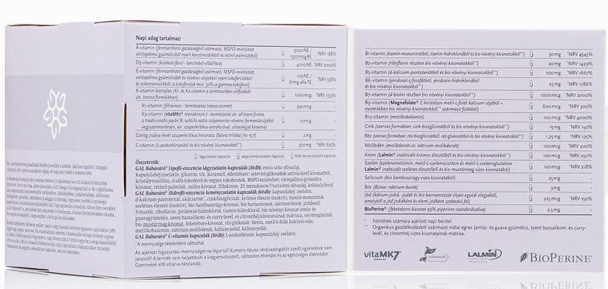 A GAL Babaváró® termékünket a legújabb kutatások fényében fejlesztettük ki, szem előtt tartva a természetességet és életszerűséget, hogy minden vitamint, ásványianyagot, nyomelemet ideális formában, mennyiségben és arányban tartalmazzon, nem eltérve attól, ahogyan ezekhez állandó tápanyagdús, változatos táplálkozással juthatnánk. Ahol előnyös, a vitaminok és ásványok részben organikus termesztésből származó (bio) gyógy- és fűszernövények kivonatából származnak. A mennyiségek esetében végig fontosnak tartottuk, hogy a napi adag biztosan tartalmazza a hatásosnak talált dózist, de semmi esetre se lépje túl az életszerű mennyiségeket, azaz azt a mennyiséget, amit táplálkozással már nem is lehetne fedezni sehogyan sem. Emellett rendkívül fontos, hogy egy új élet zavartalan fejlődését ne akadályozza semmi, ami nem odavaló. A termékünkben ilyesminek nyomát sem találja.