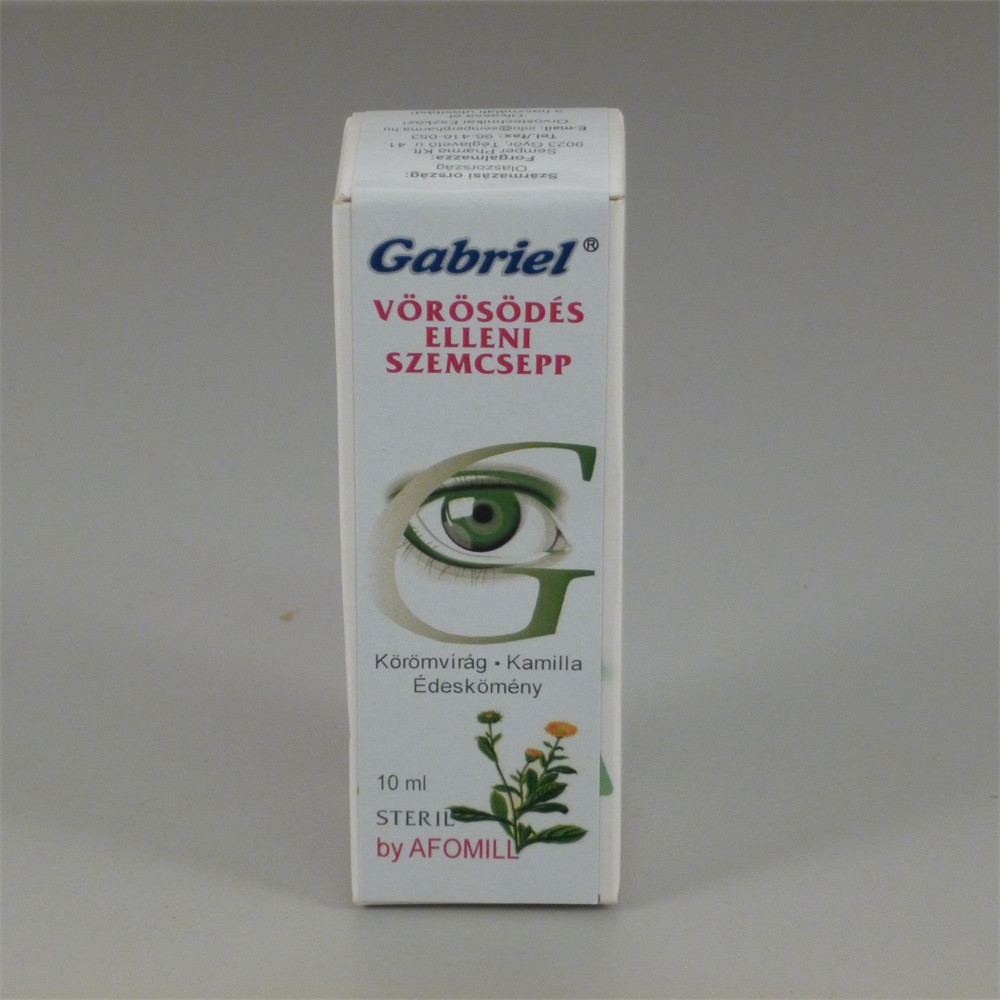GABRIEL VÖRÖSÖDÉS ELLENI SZEMCSEPP 10ML: Körömvirágot ,kamillát és édesköményt tartalmazó növényi desztillátum, mely irritált vörös szemre javasolt, Segít megszüntetni az szél, UV-sugárzás, klór, valamint smink,allergia okozta vörösödést, irritációt, és visszaállítja a szem eredeti ragyogását, tisztaságát, pH-értéke, izotóniás hatása és ozmolaritása tökéletesen összhangban van a szemszövettel és a könnyfolyadékkal.