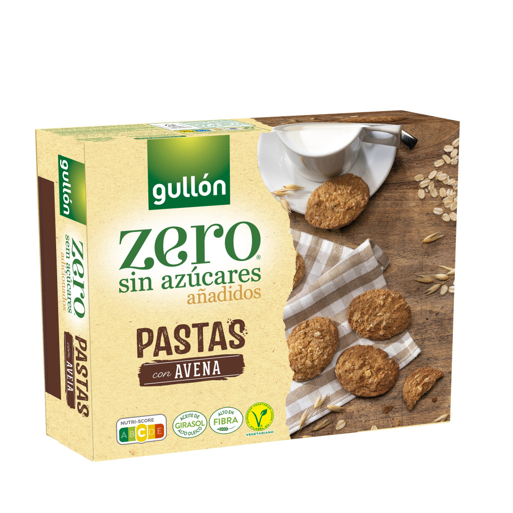 Gullon Pastas Zero házi sütemény jellegű keksz zabbal, hozzáadott cukor nélkül készült és rendkívül magas rosttartalmú (14 g/100g), édesítőszerrel