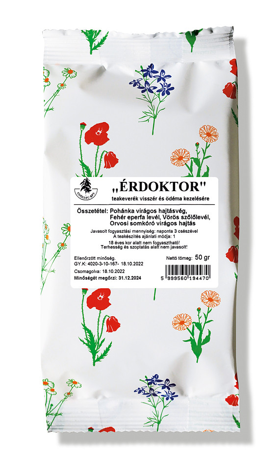 Az “ÉRDOKTOR” keringési zavarok, visszér, ödéma kiegészíto terápiához ajánlott teakeverék.