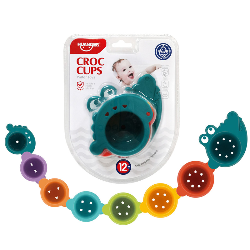 Egymásba akaszható pohárkák, melyek együtt egy színes krokodilt formáznak. A poharak egymásba illenek és átengedik a vizet a különböző alakú lyukacskákon. Kialakításának és könnyű anyagának köszönhetően mégis úszik a vizen. A gyermek játszva ismerkedik meg a színekkel.