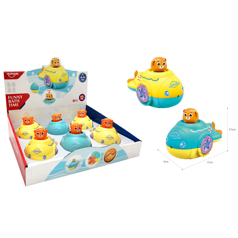 Mókás vizen úszó maci felhúzós hajókával. A csörlővel felhúzva a hajó motorcsónakká változik és úszik a vizen, miközeb a maci feje viccesen ide-oda mozog. Kék/sárga és sárga/kék kivitelben (random).