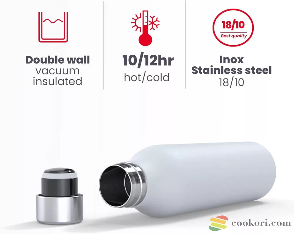 "Pure" fantázianévre keresztelt fehér színű duplafalú, fém kulacs dizájnos, környezetkímélő, tartós helyettesítője a műanyag palackoknak.