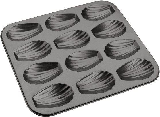 25x21 cm-es tapadásmentes sütőforma, madeleine készítéshez. Ez az aprósütemény számtalan variánsban készíthető, megunhatatlan. Télen gazdagythatjuk apró aszalt gyümölccsel, nyáron pedig málna, ribizli, áfonya, eper egyaránt kerülhet bele.