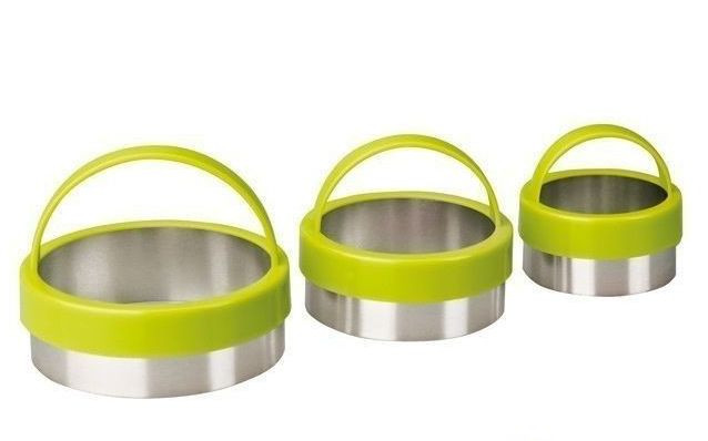 3 darabos pogácsa, vagy fánk szaggató készlet, fém kiszúróval, műanyag fogantyúval, a könnyebb használatért. A formák 5cm, 6cm és 7cm átmérőjűek és természetesen a pogácsa mellett, tallér, keksz, fánk, mézeskalács, szendvicskenyér kiszúrásához egyaránt alkalmas. Mosogatógépben mosható.