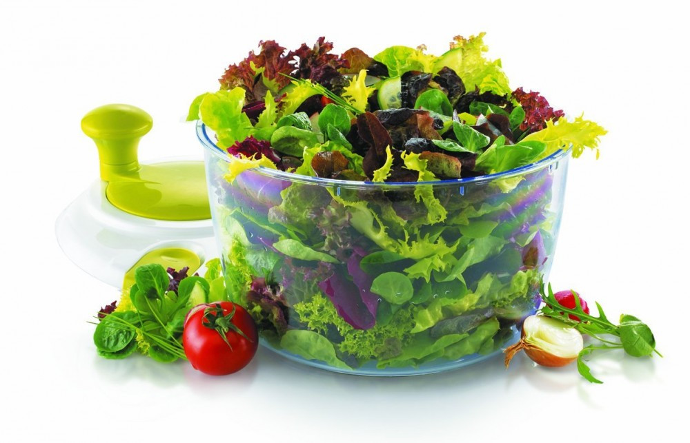 Salátacentrifuga zöld-fehér színű, műanyag, 20 cm-es átmérővel. Kiválóan alkalmas saláta, spenót, sóska mosásra és szárításra, így a levelek épek, üdék maradnak. Egyszerűen önthető rá a mosáshoz szükséges víz és ugyanilyen könnyedén önthető le a mosóvíz. Az átlátszó edény test a saláta tálalását is szolgálhatja.
