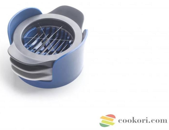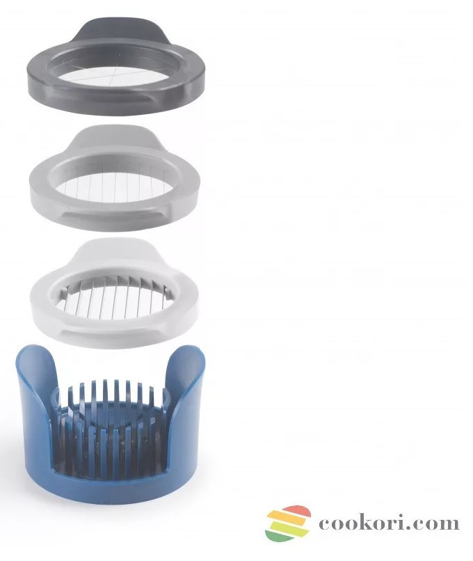 Többfunkciós főtt tojás és gomba szeletelő műanyag testel, fém szeletelő felülettel. A szeletelő felület átmérője 6cm, az eszköz teljes átmérője 11cm. A különféle szeletelők praktikusan egymáson tárolhatók.