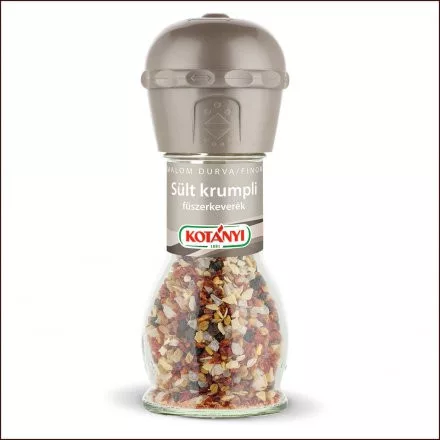 "A Kotányi Sült krumpli fűszermalommal nemcsak a sült krumplit fűszerezhetjük, hanem a tepsis burgonyát és más burgonyás ételt is. A termék gluténtartalmú gabonaféléket, tojást, tejet (laktóz), zellert, szóját, mustárt és szezámmagot is felhasználó gyártóüzemben készült. Száraz helyen tartandó. Összetevők: jódozott tengeri só (tengeri só, kálium-jodát), paprika, fokhagyma, görögszéna, vöröshagyma, bors. Tápértéktartalom