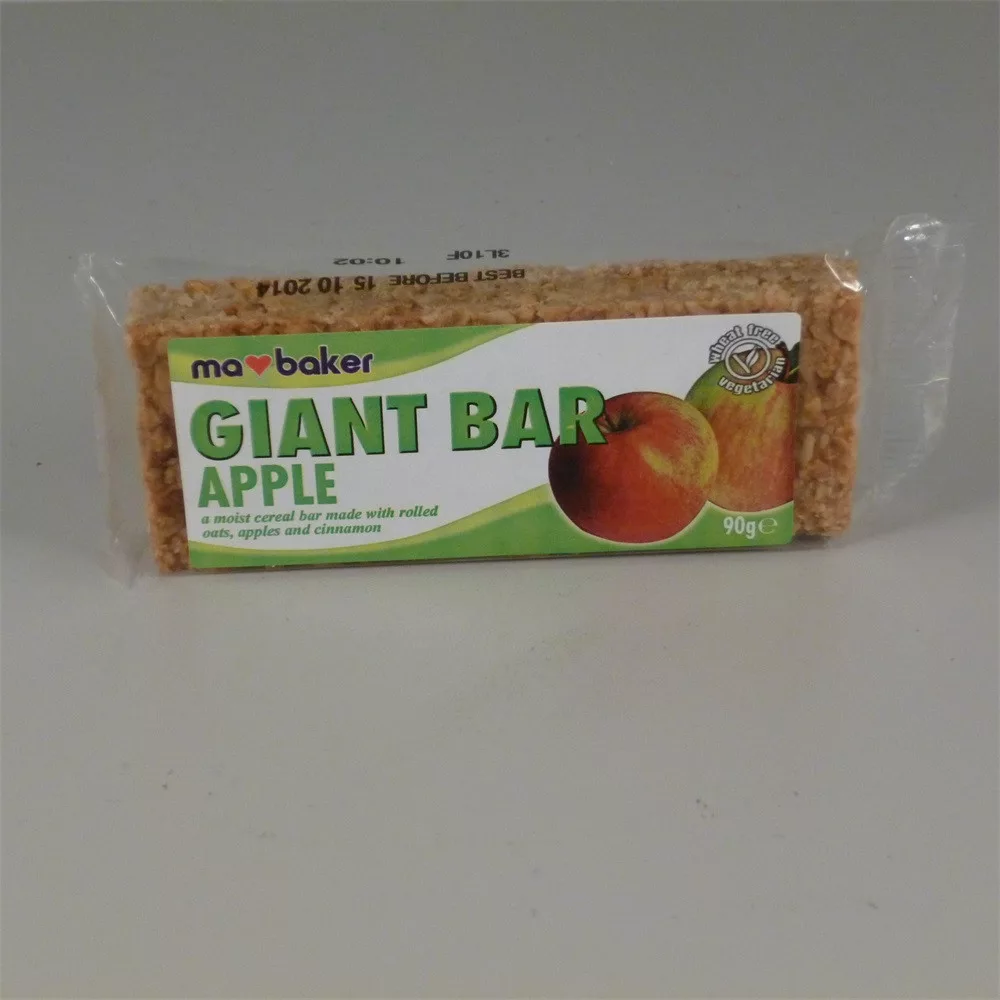 Összetevők: Zab 39%, nem-hidrogenizált növényi margarin, nádcukorszirup, nyers nádcukor, alma 7% , növényi glicerin, szójaliszt, alma aroma.