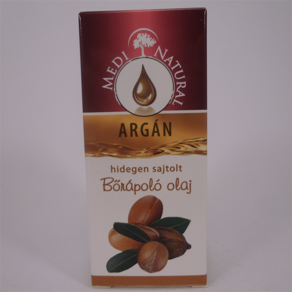 Marokkó a legjobb termőhely az argán olaj számára, a MediNatural argán olajat nyers magokból préselik, majd szénszűrön vezetik át. Gazdag telített és telítetlen zsírsavakban, észterekben, mono,-és trygliceridekben, E-vitaminban. Nagyrészt linolsav és olajsav alkotja, amelyek táplálják és hidratálják a bőrt.