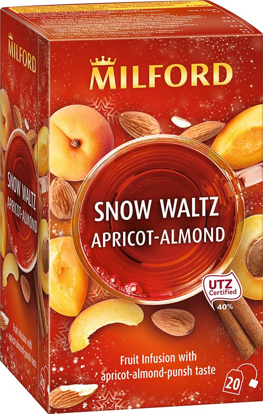 SNOW WALTZ Sárgabarack, mandula,puncs ízű gyümölcstea. Összetevők: Hibiszkusz, csipkebogyó, alma, narancshéj, aroma, fahéj (5 %), sztívia, édes szederlevél, sárgabaracklé-granulátum (maltodextrin, sárgabaracklé-sűrítmény)