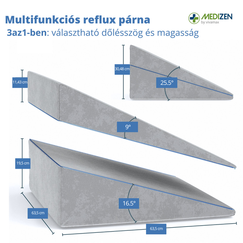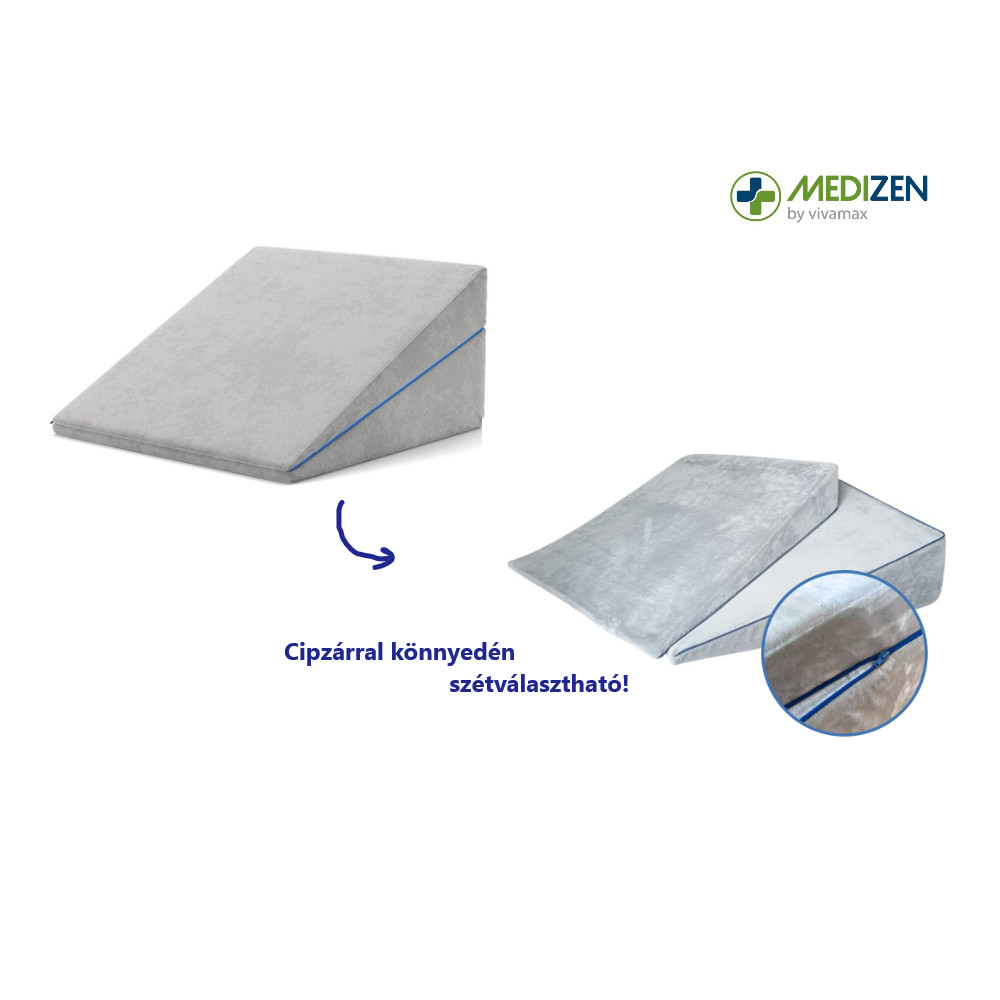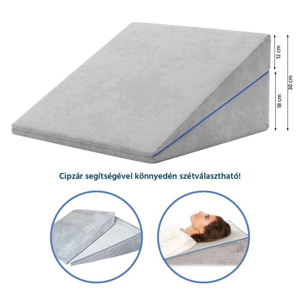 Ék alakú reflux párna, amely megemeli a felsőtestet, így kényelmesebb, stabil fekvést ad éjszaka. Széles kialakítású, forgolódáskor sem csúszik le. Ketté cipzározható, ezért többféle magasságban, háttámaszként vagy lábtámaszként is használható.