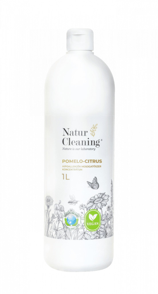 A Naturcleaning Pomelo-Citrus Hipollaergén mosogatószer koncentrátum foszfátmentes, klórmentes, parabénmentes, állatkísérlet mentes, vegán, természetes összetevőkből készült (kukoricaolaj, kókuszolaj).