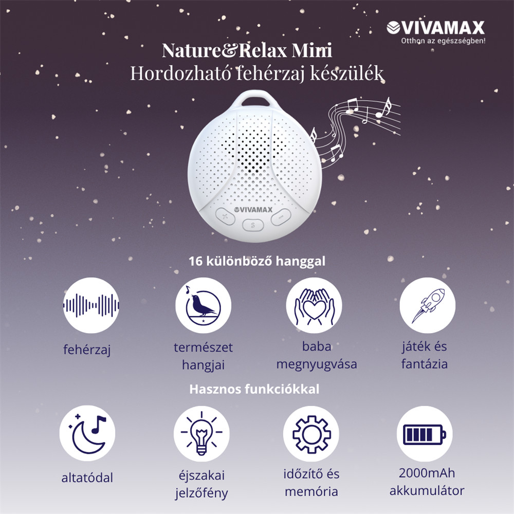 • 16 féle megnyugtató hang (ropogó tábortűz, tenger morajlása, nyári zápor, szívdobogás, ventillátor, stb.)