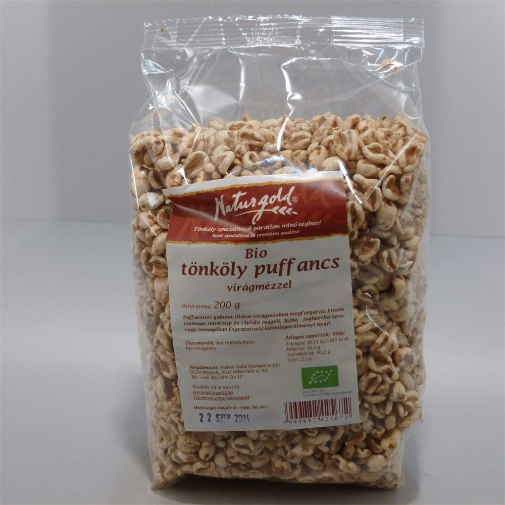 NATURGOLD BIO TÖNKÖLY PUFFANCS MÉZES Teljes öko tönköly szemből gőz segítségével készült puffasztott termék. A tönköly szemeket a puffasztás után bio virágmézzel szórjuk be így válik még élvezhetőbbé és egészségesebbé a terméket.
