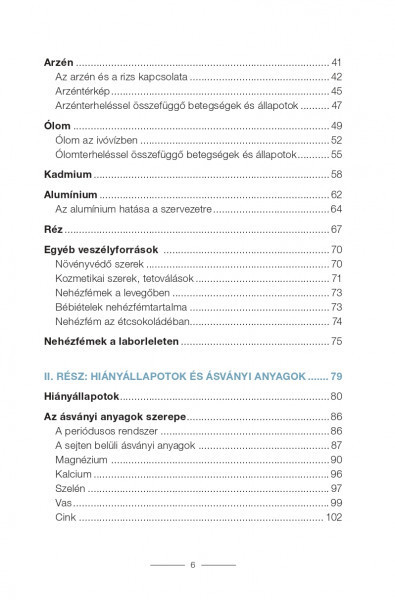 A könyvben a nehézfémek veszélyein túl a kivezetés gyakorlati kérdéseire is választ kap az olvasó, végigvesszük a szükséges ásványi anyagokat, azok pótlási lehetőségeit, a kivezetéshez valóban hasznos módokat, gyógynövényeket, szereket.
