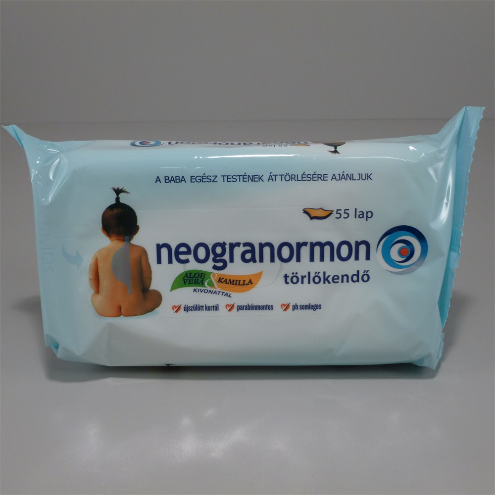 NEOGRANORMON BABA TÖRLŐKENDŐ 55 LAPOS A Neogranormon vastag, puha, textilhatású törlőkendő aloe vera és kamilla kivonat tartalmának köszönhetően gyengéden ápolja és tökéletesen tisztítja a baba érzékeny bőrét. A baba egész testének áttörlésére ajánljuk.
