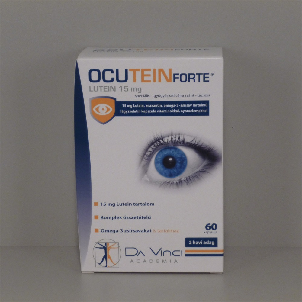 Az OCUTEIN FORTE készítmény 15 mg luteint, többszörösen telítetlen omega-3 zsírsavakat, A- és B2-vitamint, valamint olyan vitaminokat és nyomelemeket (C- és E-vitamin, a cink, réz és szelén) tartalmaz, melyek hozzájárulnak a sejtek oxidatív stressz elleni védeleméhez. A készítmény jelentős DHA (dokozahexaénsav) és EPA (eikozapentaénsav) tartalmú halolajjal készült. A DHA a retina szerkezetének része, így szerepet játszik a normál látás fenntartásában. A Karotinoidokhoz tartozó lutein és zeaxantin főként a makula luteában találhatók magas koncentrációban, a makula alkotóelemei. A Vitamin és ásványianyag-komplex tagjai, a C- és E-vitamin, a cink, réz és szelén nyomelemek hozzájárulnak a sejtek oxidatív stressz elleni védelméhez. Az A- és B2-vitaminoknak normál látás fenntartásában van szerepük.