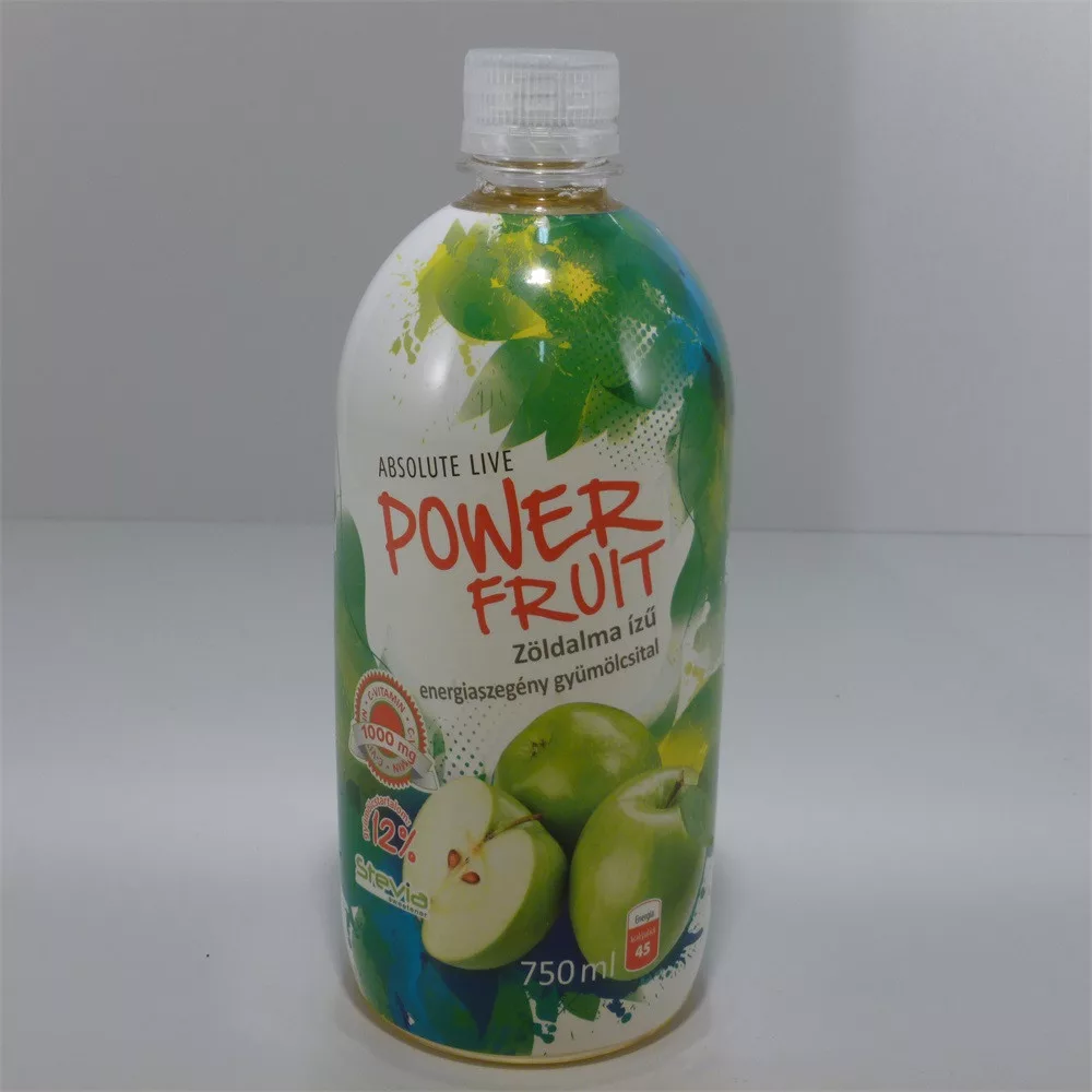 POWERFRUIT ITAL ZÖLDALMA zöldalma ízű üdítőital 12% gyümölcstartalommal. C-vitamin tartalom 1000 mg / palack. STEVIA természetes növényi kivonatból származó édesítőszerrel. Összesen csak 45 Kcal egy palackban!