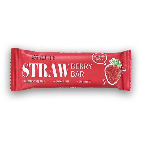 Összetevők: datolya (55%), alma (22%), fagyasztva szárított eper (13%), mandula (10%). A RAW ME gyümölcsszelet nyers eljárással készül természetes alapanyagokból. Intenzív gyümölcsös ízét a fagyasztva szárított gyümölcs adja. Magas energiatartalmának köszönhetően a szervezetünket megfelelő energiához juttatja két étkezés között.
