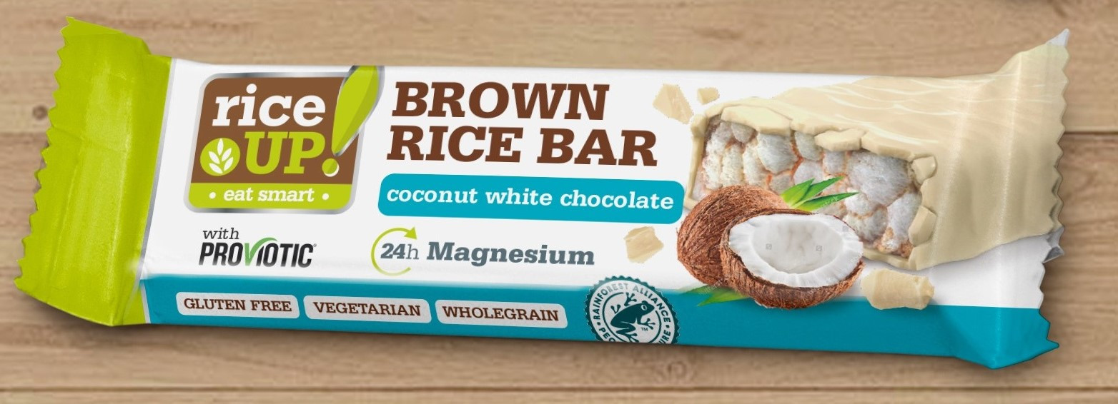 Rendkívül ropogós, gluténmentes rizsszelet teljes kiőrlésű barna rizsből, kókuszis ízű lágy fehércsokoládéval bevonva.