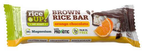 Rice Up puffasztott barna rizsszelet narancsos ízesítésű étcsokoládé bevonattal.