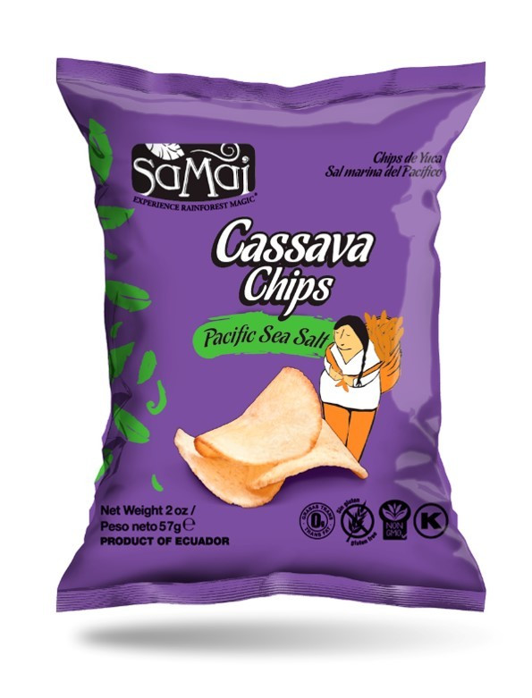 Ropogós cassava chips, mely kis adagokban, tengeri sóval ízesítve készül. A cassava chips 30%-kal kevesebb zsírt tartalmaz, mint a hagyományos burgonya chips.