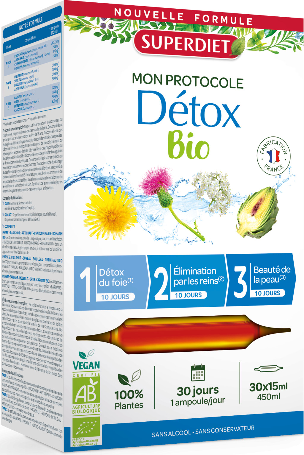 10 növény a gyengéd méregtelenítéshez: 1. lépés: segíti a májtoxinok eltávolítását és a májsejtek védelmét (10 nap). 2. lépés: Stimulálja a salakanyagok vesén keresztül történő eltávolítását. 3. lépés: Elősegíti a méreganyagok eltávolítását a bőrön keresztül. Ideális a fáradt vagy túlterhelt szervezet számára, 3x10 napos kúra keretében. A kúra befejezése után javasoljuk a SUPERDIET SPIRULINA termékünket az ásványi anyagok gyors és komplex visszapótlása érdekében.