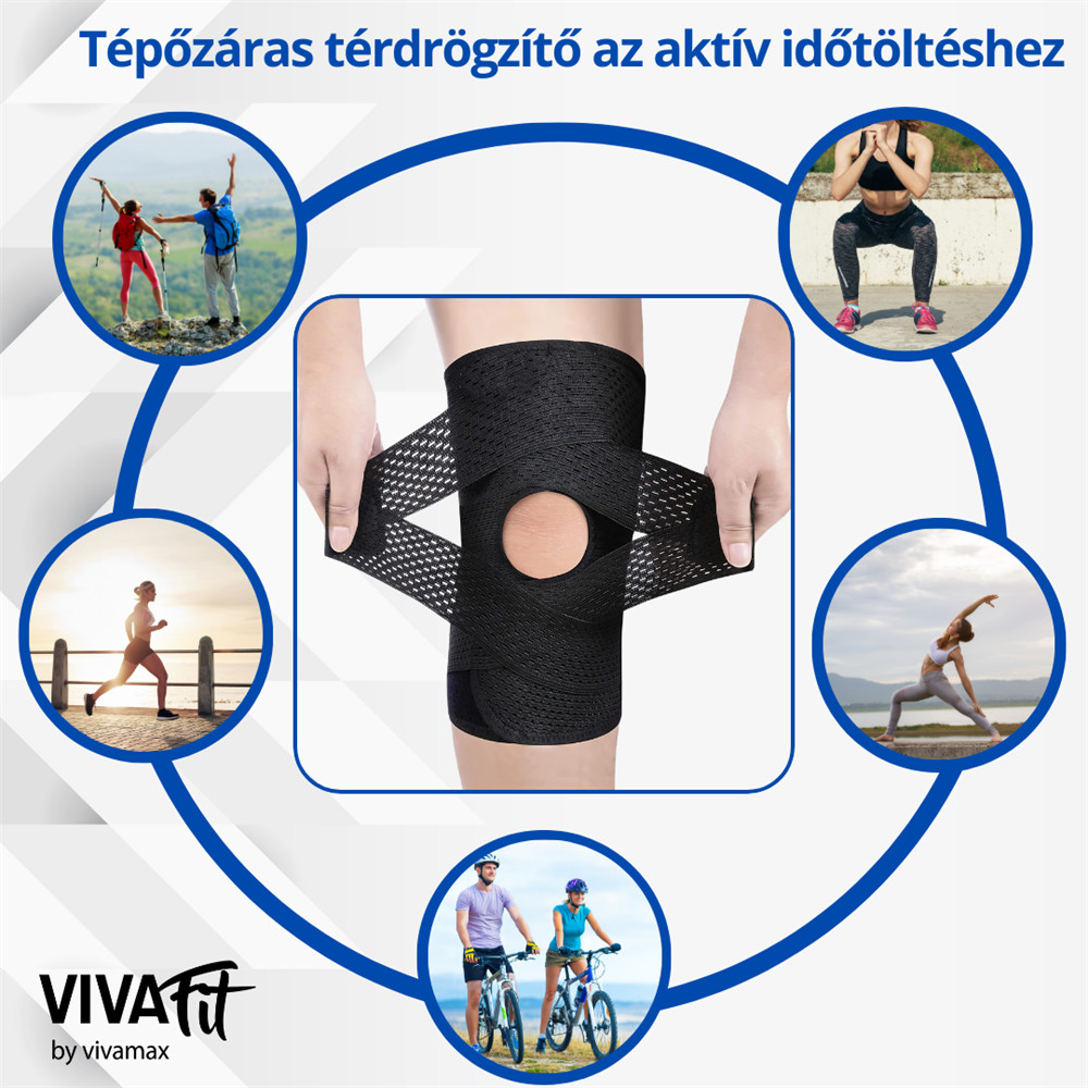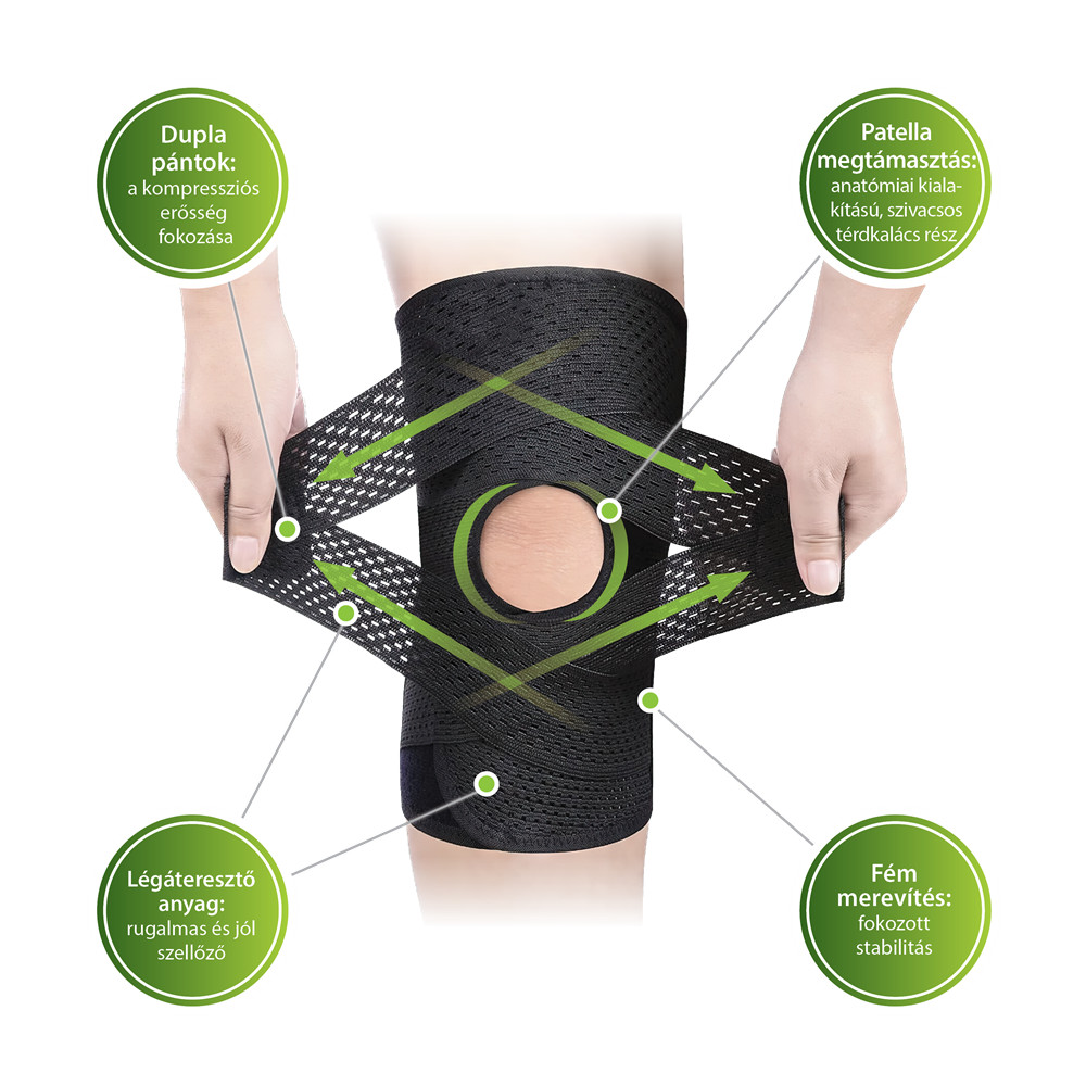 • Két oldalt rugalmas fém merevítést helyzetünk el, hogy a térdszorító még biztosabb tartást adjon, ugyanakkor a szabadmozgást nem gátolja.