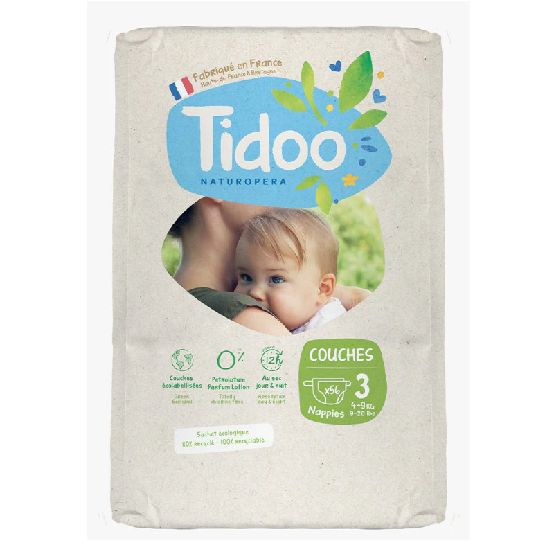 Tidoo 60%-ban lebomló ultramaggal, latexmentes, klórmentes ökopelenka. Kifejezetten 4-9 kg-os babák számára kifejlesztett pelenka rugalmas tépőzárral és kiváló nedszívó képességgel.
