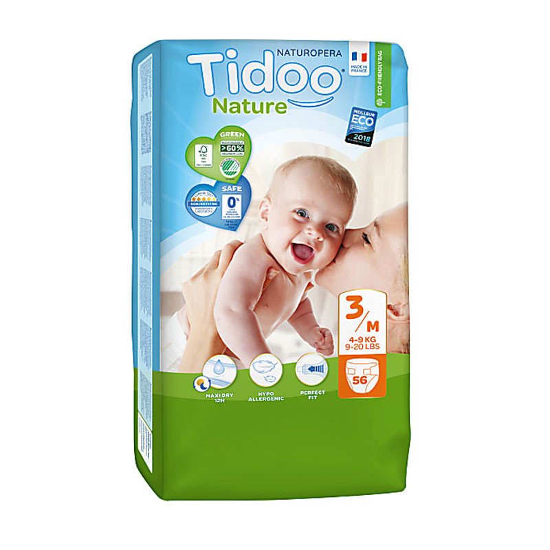 Tidoo 60%-ban lebomló ultramaggal, latexmentes, klórmentes ökopelenka. Kifejezetten 4-9 kg-os babák számára kifejlesztett pelenka rugalmas tépőzárral és kiváló nedszívó képességgel.