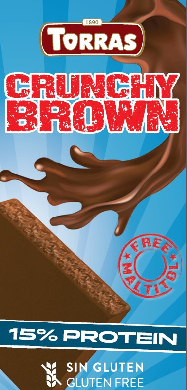 Torras Crunchy Brown tejcsokoládé édesítőszerrel és extrudált szójafehérjével, 15% proteinnel.