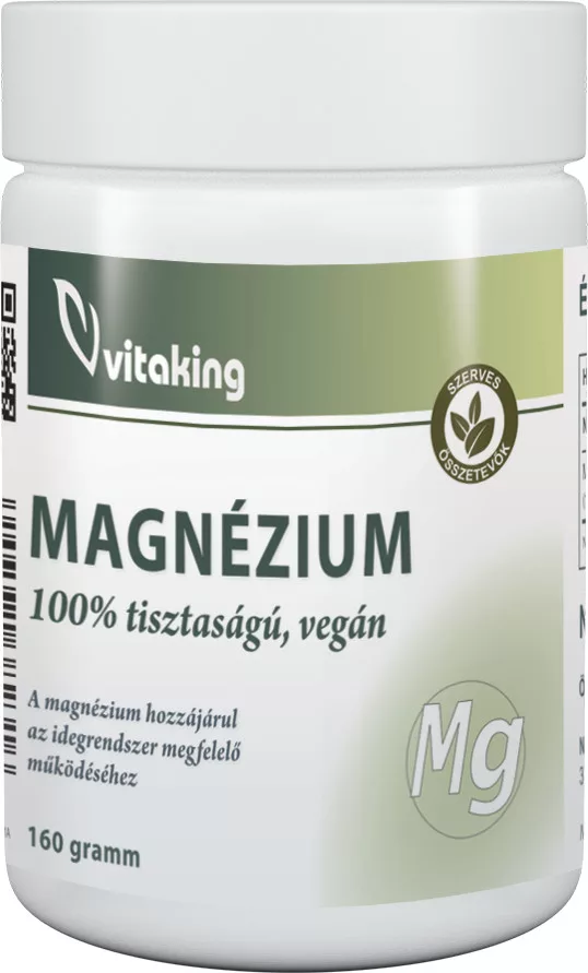 Kevés ember van tudatában annak, hogy mennyire fontos ez az ásványi anyag. Az oxigén, a víz és a fő tápanyagok (zsír, protein, szénhidrátok) után, a magnézium a talán egyik legfontosabb építőelem, amire a szervezetnek szüksége van. A magnézium egy létfontosságú ásványi anyag a szervezet számára. A Vitaking magnézium készítménye 160 g magnézium port tartalmaz. Napi ajánlott mennyisége (3 csapott adagoló kanál) megfelel 250mg elemi magnéziumnak.
