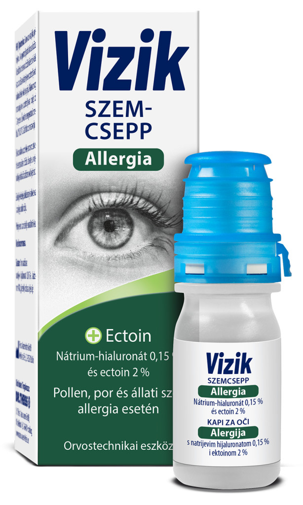 VIZIK Allergia szemcsepp természetes és klinikailag vizsgált összetevőket tartalmaz, melyek hatékonysága tudományosan igazolt. A szemcsepp nátrium-hialuronátot tartalmaz, ami a hialuronsav nátriumsója, mely különleges fizikai tulajdonsága miatt egy egyenletes, stabil és különösen hosszantartóan tapadó védőfilmet képez a szaruhártyán, anélkül hogy a vizuális teljesítményt befolyásolná. Ectoint is tartalmaz, ami egy természetes sejtvédő molekula irritációcsökkentő és membránstabilizáló tulajdonságokkal, mely megköti a nedvességet, valamint stabilizálja a könnyfilm lipidrétegét.