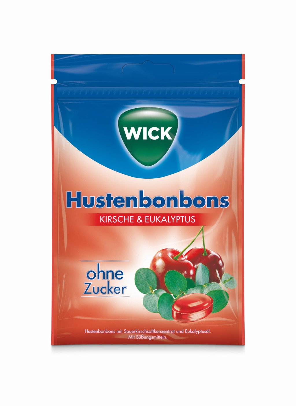 A cseresznye ízű Wick torokcukorka cukormentes és eukaliptuszolajt is tartalmaz.