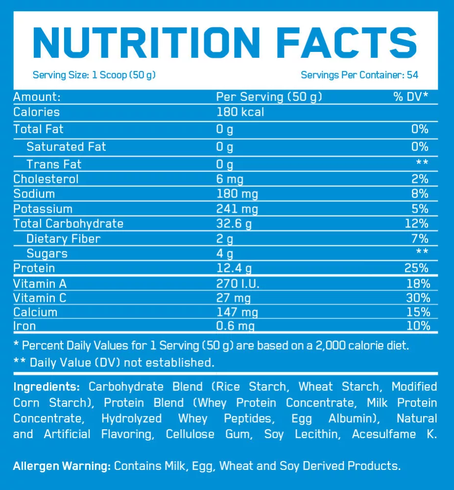 Összetevők: Szénhidrát keverék (Rizs keményítő, búzakeményítő, módosított kukoricakeményítő), fehérje keverék (tejsavó fehérje koncentrátum, tejfehérje koncentrátum, hidrolizált tejsavipeptidek, tojás albumin), anabolikus aktivátor keverék (kreatin-monohidrát, kreatin-hidroklorid, L-lizin, L-metionin, L-fenilalanin, L-treonin, L-triptofán), VITAMIN / MINERAL keverék (Beta Karotin, kolekalciferol, DL-alfa-tokoferil-acetát, aszkorbinsav, tiamin, riboflavin, niacin, pantoténsav, piridoxin HCl, cianokobalamin, folinsav, biotin, K-vitamin (Phytonadione)), természetes és mesterséges aromák, Lecitin, surcalóz, aceszulfám-k